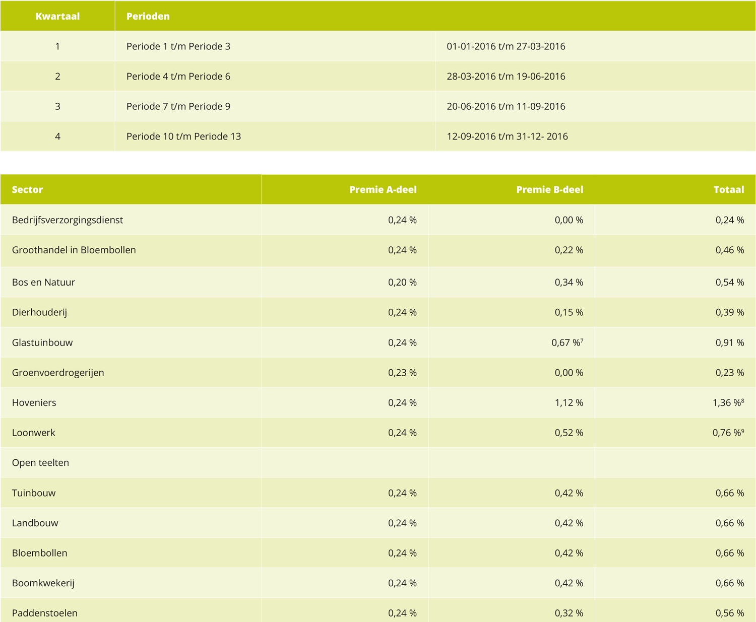 2) Afhankelijk van deelname en cao. Geldt voor de cao Open Teelten (Tuinbouw, Landbouw, Bloembollen en Boomkwekerij), LEO, Hommel en Van Kessel B.V. Voor deze cao’s wordt in 2016 geen premie geheven.