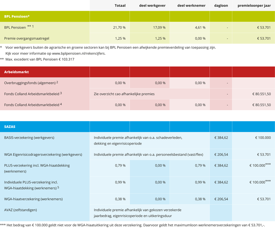 2) Afhankelijk van deelname en cao. Geldt voor de cao Open Teelten (Tuinbouw, Landbouw, Bloembollen en Boomkwekerij), LEO, Hommel en Van Kessel B.V. Voor deze cao’s wordt in 2017 geen premie geheven.