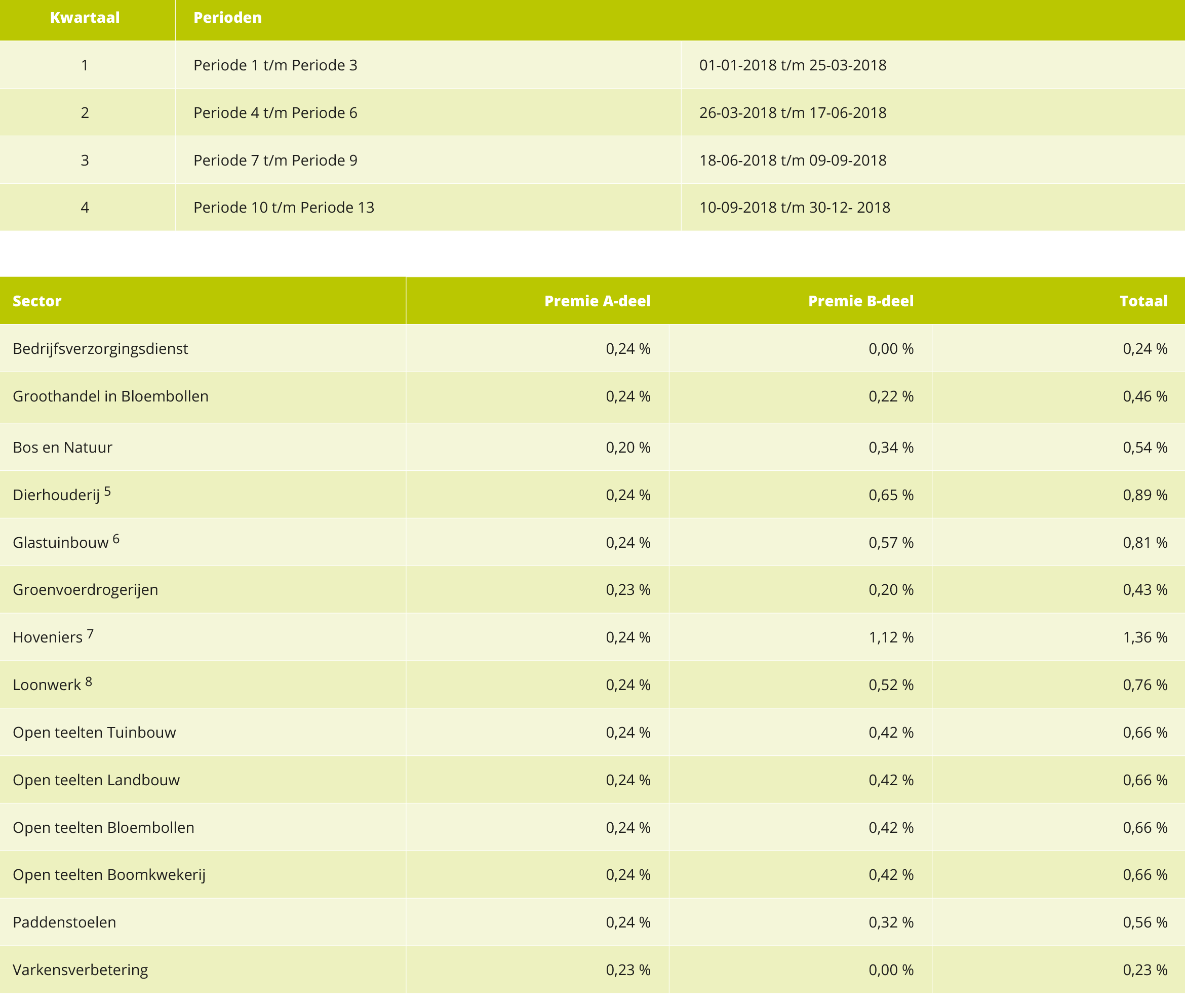 2) Afhankelijk van deelname en cao. Geldt voor de cao Open Teelten (Tuinbouw, Landbouw, Bloembollen en Boomkwekerij), LEO, Hommel en Van Kessel B.V. Voor deze cao’s wordt in 2018 geen premie geheven.