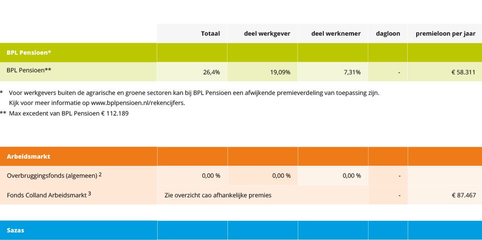 3) De premie voor het fonds Colland Arbeidsmarkt verschilt per sector en wordt, tenzij anders vermeld, betaald door de werkgever. De hoogte van de premie hangt af van de omvang en de aard van de arbeidsmarktactiviteiten waar een sector voor heeft gekozen. Kijk voor meer informatie op www.collandarbeidsmarkt.nl.