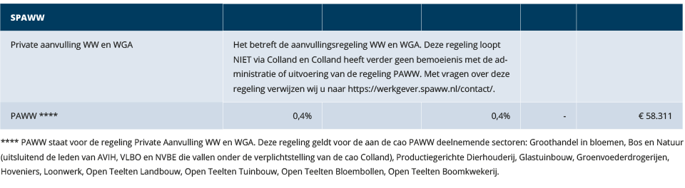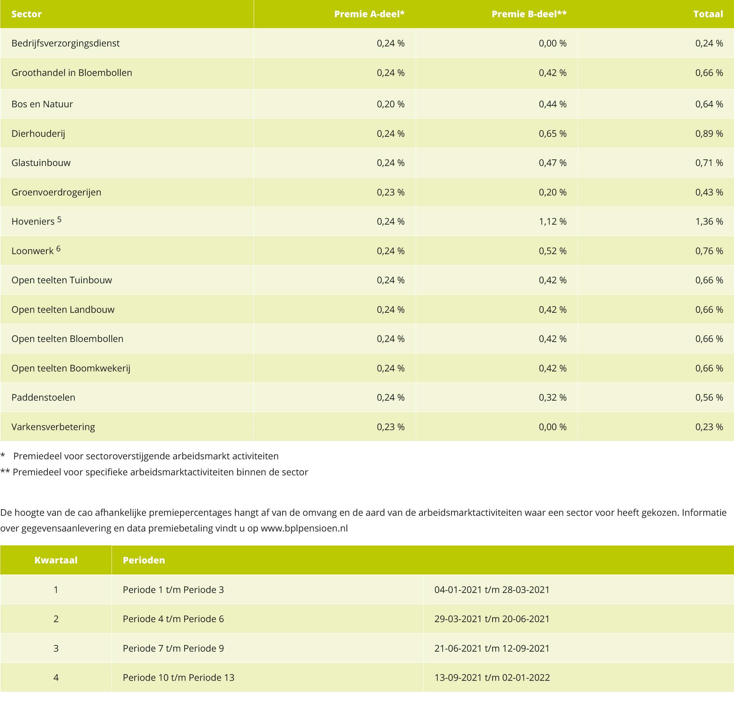 2) Afhankelijk van deelname en cao. Geldt voor de cao’s Open Teelten (Akkerbouw, Bloembollenteelt, Buitenbloemen, Boomkwekerij, Fruitteelt en Vollegrondsgroenteteelt), Groen Grond en Infrastructuur (GGI),  Hommel en Van Kessel B.V.