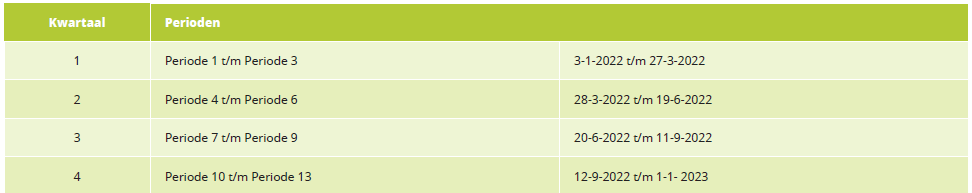 De premienota voor Colland Arbeidsmarkt wordt na afloop van het kwartaal verzonden. Voor werkgevers met een maandelijkse verloning wordt de nota per 3 maanden opgesteld. Voor werkgevers met vierwekenverloning worden de kwartalen op de volgende wijze ingedeeld: